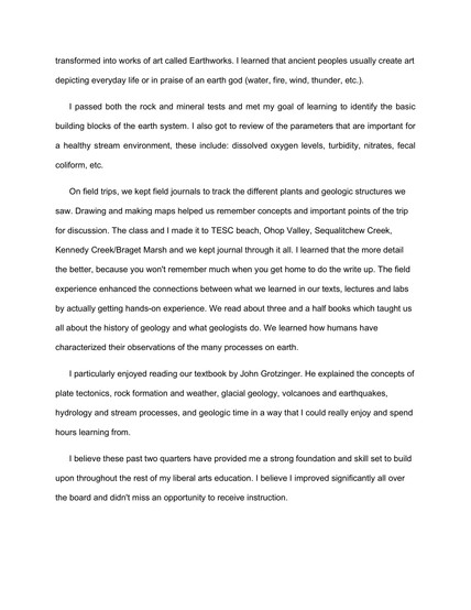 Evergreen functions on the quarter system, and the first class I took spanned two quarters. It was called “Drawing on the Earth,” and it included instruction in geology, drawing, and the study of Earthworks, or using elements you find outside to create temporary art installations in nature. Most of our projects included synthesizing what we learned about geology into something beautiful and communicative in nature. This was my first exposure to science communication using art, and it is something I am still very passionate about.